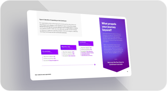 Figure 4. Bene昀椀ts of Expanding on the Continuum What propels For organizations that are leveraging the Continuum by using cloud and your journey cloud-based technologies in more signi昀椀cant ways, the bene昀椀ts include bottom-line savings such as cost reduction and increased speed to market, beyond? and top-line growth in sales via cross-sell and/or up-sell. The percentages are based on responses regarding adoption of 25 technologies enabled by Some steps toward becoming a Continuum the Cloud Continuum and six Continuum practices. Competitor are clear-cut. Others less so, but our global survey and in-depth executive interviews clearly demonstrate the Continuum potential and mindsets of those that recognize Continuum: and exploit it. Cloud is a permanent commitment to reinvention Before you get started, however, the 昀椀rst Migration-only: step is to understand the nature of the Cloud is a fixed destination Cloud tech adoption: 72% Cloud Continuum: Speed and change are its Continuum practices: 77% fundamental facets. Continuum practices that On-premises: Cloud tech adoption: 40% Key benefit: Cost reduction, can harness the continual improvements and Cloud is not a priority innovation, speed to market, expansion of cloud capabilities are crucial. Continuum practices: 38% cross sell & up sell, Cloud tech adoption: 0% Key benefit: Cost reduction diversification and more. Continuum practices: 0% Key benefit: Keep the lights on Here are the four keys to Continuum success Ever–ready for every opportunity 13