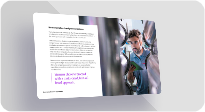 Siemens makes the right connections That’s the situation at Siemens AG. The 174-year-old company’s rapid pivot to Industry 4.0 and becoming a highly advanced industrial manufacturer a few years ago was largely enabled by the Cloud Continuum. Siemens made the decision to help engineering and manufacturing companies use vast amounts of data from their factories, equipment and production processes to operate more ef昀椀ciently—all in alignment with the company’s Industry 4.0 vision. To do so, it recognized those companies would need to embrace digital transformation—driven by automation, edge and cloud computing. It also understood those companies use a diverse landscape of different platforms, so offering cross-platform interoperability with innovation would be important. Siemens chose to proceed with a multi-cloud, best-of-breed approach, working with multiple cloud providers to broaden the choice of platforms offered to companies, as well as investing in an advanced set of capabilities across those providers to continually optimize and improve manufacturing. Siemens chose to proceed with a multi-cloud, best-of- breed approach. Ever–ready for every opportunity 16