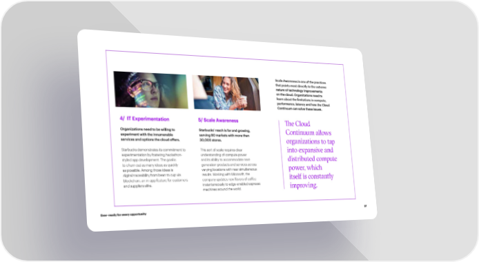 Scale Awareness is one of the practices that points most directly to the extreme nature of technology improvements on the cloud. Organizations need to learn about the limitations in compute, performance, latency and how the Cloud Continuum can solve these issues. 4/ IT Experimentation 5/ Scale Awareness 吀栀e Cloud Organizations need to be willing to Starbucks’ reach is far and growing, Continuum allows experiment with the innumerable serving 80 markets with more than services and options the cloud offers. 30,000 stores. organizations to tap Starbucks demonstrates its commitment to This sort of scale requires clear into expansive and experimentation by fostering hackathon- understanding of compute power styled app development. The goal is and its ability to accommodate next- distributed compute to churn out as many ideas as quickly generation products and services across power, which as possible. Among those ideas is varying locations with near simultaneous digital traceability from bean to cup via results. Working with Microsoft, the itself is constantly blockchain, an in-app feature for customers company updates new 昀氀avors of coffee and suppliers alike. instantaneously to edge-enabled espresso improving. machines around the world. Ever–ready for every opportunity 27