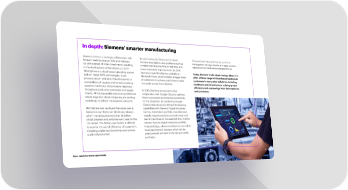 In depth: Siemens’ smarter manufacturing Siemens entered a strategic collaboration with By connecting the factory to the cloud, This saves both time and money, as central Amazon Web Services in 2012 and followed workers were able to view problems such as management of edge devices and apps reduces up with a series of other investments, resulting a malfunctioning machine, in real-time, and deployment and maintenance expenditures. in the development of MindSphere in 2017. make immediate improvements. By 2018, MindSphere is a cloud-based operating system Siemens made MindSphere available on Today, Siemens’ multi-cloud strategy allows it to built on native AWS technologies. It can Microsoft Azure, which enabled a bigger base offer offers a range of cloud-based solutions to process data, in real-time, from thousands or of customers to achieve quick time-to-value customers in many other industries, including even millions of devices and sensors in plants, and scale across the enterprise. healthcare and infrastructure, to bring greater systems, machinery and products dispersed ef昀椀ciency and cost savings from their machines throughout production processes and supply In 2019, Siemens announced a new and processes. chains. All this is possible due to an architecture cooperation with Google Cloud to optimize where edge and cloud computing are working factory processes and improve productivity seamlessly to deliver this business outcome. on the shop 昀氀oor. By combining Google Cloud’s data cloud and AI/machine learning MindSphere was deployed that same year at capabilities with Siemens’ Digital Industries Siemens’s own factory in Monterrey, Mexico, Factory Automation portfolio, manufacturers which manufactures more than 28 million visually inspect products or predict wear-and- circuit breakers and switches every year for the tear of machines on the assembly line. Another US market. The factory was 昀椀nding it dif昀椀cult solution from its digital enterprise portfolio, to monitor the overall ef昀椀ciency of equipment, Industrial Edge, allows manufacturers to collect including unplanned downtimes and uneven local data from IoT devices, which can be quality of production. preprocessed and sent to the cloud in small packages. Ever–ready for every opportunity 17
