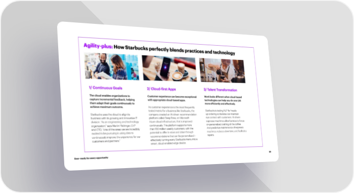 Agility-plus: How Starbucks perfectly blends practices and technology 1/ Continuous Goals 2/ Cloud-昀椀rst Apps 3/ Talent Transformation The cloud enables organizations to Customer experience can become exceptional Work looks different when cloud-based capture incremental feedback, helping with appropriate cloud-based apps. technologies can help you do your job them adapt their goals continuously to more ef昀椀ciently and effectively. achieve maximum outcome. As customer experience is the most frequently tested metric for a business like Starbucks, the Starbucks is testing NLP for heads- Starbucks uses the cloud to align its company created an AI-driven recommendation up ordering so baristas can maintain business with its growing and innovative IT platform called Deep Brew, on Microsoft eye contact with customers. AI-driven division. “As an engineering and technology Azure cloud infrastructure, that is improved espresso machines allow baristas to focus organization,” says Martin Flickinger, EVP continuously. This platform supports more on personalized crafting of the coffee. and CTO, “one of the areas we are incredibly than 100 million weekly customers, with the And predictive maintenance of espresso excited to be pursuing is using data to potential to offer in-store and drive-through machines reduces downtime and facilitates continuously improve the experience for our recommendations that can be personalized— repairs. customers and partners.” effectively turning every Starbucks menu into a smart, cloud-enabled edge device. Ever–ready for every opportunity 26