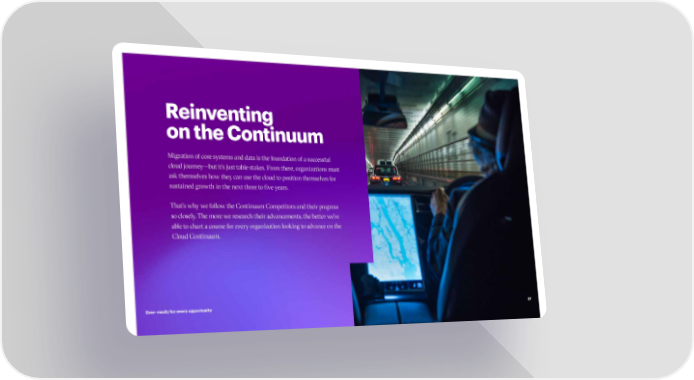 Reinventing on the Continuum Migration of core systems and data is the foundation of a successful cloud journey—but it’s just table stakes. From there, organizations must ask themselves how they can use the cloud to position themselves for sustained growth in the next three to five years. That’s why we follow the Continuum Competitors and their progress so closely. The more we research their advancements, the better we’re able to chart a course for every organization looking to advance on the Cloud Continuum. Ever–ready for every opportunity 37