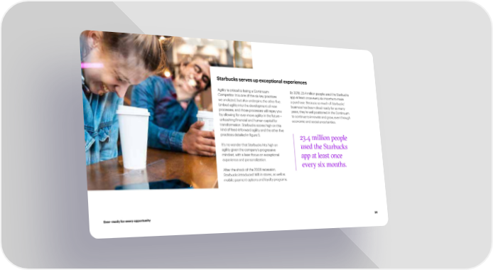 Starbucks serves up exceptional experiences Agility is critical to being a Continuum By 2018, 23.4 million people used the Starbucks Competitor. It is one of the six key practices app at least once every six months to make we analyzed, but also underpins the other 昀椀ve. a purchase. Because so much of Starbucks’ Embed agility into the development of new business has been cloud-ready for so many processes, and those processes will repay you years, they’re well positioned in the Continuum by allowing for ever-more agility in the future— to continue to innovate and grow, even through unleashing 昀椀nancial and human capital for economic and social uncertainties. transformation. Starbucks scores high on this kind of feed-it-forward agility and the other 昀椀ve practices detailed in 昀椀gure 5. 23.4 million people It’s no wonder that Starbucks hits high on used the Starbucks agility given the company’s progressive mindset, with a laser focus on exceptional app at least once experience and personalization. every six months. After the shock of the 2008 recession, Starbucks introduced Wi昀椀 in stores, as well as mobile payment options and loyalty programs. Ever–ready for every opportunity 24