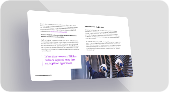 BHI isn’t alone in putting technology at the center of its strategy. Across 3M scales up to double down industries we see that every company is becoming a technology company. This is possible because of the democratization of technology that has Similarly, at 3M, Michael G. Vale, EVP of the company’s Safety & Industrial accelerated in recent years—empowering every business to build their Business Group, talks about “a very strong mentality of empowerment in realities with tech. Explore more in Tech Vision 2021. the organization—shared goals, shared directions, shared framework and Increased IT visibility and accountability has helped solve business guardrails, all empowering people to act as they see 昀椀t. With that combination of alignment and empowerment, things happen a lot more quickly and more problems and led to increased pro昀椀tability. powerfully than before.” AppSheet is simple to use and produces quick results. As AppSheet is a 3M started its cloud journey in 2016, selecting AWS as a partner. It started with no-code platform, and it’s easier to learn how to build and maintain apps several important applications, gradually moving more to the cloud. Then the on it than with traditional platforms. In less than two years, BHI has built COVID-19 pandemic struck. As hospitals across the country were in desperate and deployed more than 115 AppSheet applications. This self-suf昀椀ciency need of protective gear to prevent healthcare workers from contracting the with in-house, no-code app development has enabled BHI to reduce its virus, 3M saw unprecedented demand for its respirators and PPE. How was it dependence on third-party software products and freed up 10 percent of able to scale up? current IT spend. In less than two years, BHI has built and deployed more than 115 AppSheet applications. Ever–ready for every opportunity 35