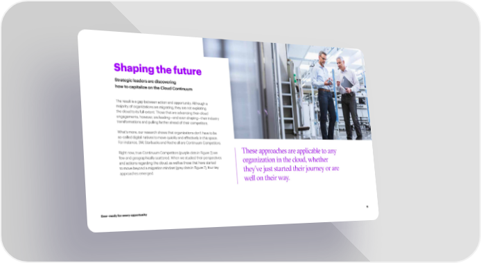 Shaping the future Strategic leaders are discovering how to capitalize on the Cloud Continuum The result is a gap between action and opportunity: Although a majority of organizations are migrating, they are not exploiting the cloud to its full extent. Those that are advancing their cloud engagements, however, are leading—and even shaping—their industry transformations and pulling farther ahead of their competitors. What’s more, our research shows that organizations don’t have to be so-called digital natives to move quickly and effectively in this space. For instance, 3M, Starbucks and Roche all are Continuum Competitors. Right now, true Continuum Competitors (purple dots in Figure 2) are These approaches are applicable to any few and geographically scattered. When we studied their perspectives organization in the cloud, whether and actions regarding the cloud, as well as those that have started to move beyond a migration mindset (grey dots in Figure 2), four key they’ve just started their journey or are approaches emerged. well on their way. Ever–ready for every opportunity 11