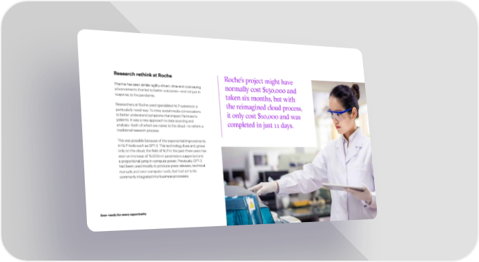 Research rethink at Roche Roche’s project might have Pharma has seen similar agility-driven, time-and cost-saving normally cost $150,000 and advancements that led to better outcomes—and not just in response to the pandemic. taken six months, but with Researchers at Roche used specialized NLP systems in a the reimagined cloud process, particularly novel way: To mine social media conversations it only cost $10,000 and was to better understand symptoms that impact Parkinson’s patients. It was a new approach to data sourcing and completed in just 11 days. analysis—both of which are native to the cloud—to rethink a traditional research process. This was possible because of the exponential improvements in NLP tools such as GPT-3. This technology lives and grows only on the cloud; the 昀椀eld of NLP in the past three years has seen an increase of 15,000x in parameters supported and a proportional jump in compute power. Previously, GPT-3 had been used mostly to produce press releases, technical manuals and even computer code, but had yet to be commonly integrated into business processes. Ever–ready for every opportunity 23