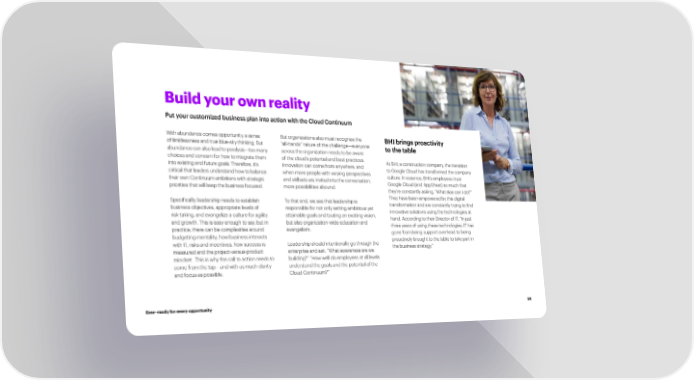 Build your own reality Put your customized business plan into action with the Cloud Continuum With abundance comes opportunity, a sense But organizations also must recognize the BHI brings proactivity of limitlessness and true blue-sky thinking. But “all-hands” nature of the challenge—everyone to the table abundance can also lead to paralysis—too many across the organization needs to be aware choices and concern for how to integrate them of the cloud’s potential and best practices. At BHI, a construction company, the transition into existing and future goals. Therefore, it’s Innovation can come from anywhere, and to Google Cloud has transformed the company critical that leaders understand how to balance when more people with varying perspectives culture. In essence, BHI’s employees trust their own Continuum ambitions with strategic and skillsets are invited into the conversation, Google Cloud (and AppSheet) so much that priorities that will keep the business focused. more possibilities abound. they’re constantly asking, “What else can I do?” Speci昀椀cally, leadership needs to establish To that end, we see that leadership is They have been empowered by this digital business objectives, appropriate levels of responsible for not only setting ambitious yet transformation and are constantly trying to 昀椀nd risk-taking, and evangelize a culture for agility attainable goals and touting an exciting vision, innovative solutions using the technologies at and growth. This is easy enough to say, but in but also organization-wide education and hand. According to their Director of IT, “In just practice, there can be complexities around evangelism. three years of using these technologies, IT has budgeting mentality, how business interacts gone from being support overhead to being with IT, risks and incentives, how success is Leadership should intentionally go through the proactively brought to the table to take part in measured and the project-versus-product enterprise and ask, “What awareness are we the business strategy.” mindset. This is why the call to action needs to building?” “How well do employees at all levels come from the top—and with as much clarity understand the goals and the potential of the and focus as possible. Cloud Continuum?” Ever–ready for every opportunity 34
