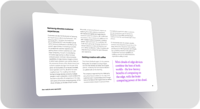 Samsung elevates customer Meanwhile, at Samsung Research, experts are It is deploying augmented reality so customers experiences exploring AI to make customer interactions can use their phones to get the behind-the- with devices and appliances hassle-free and scenes story of the coffee, from sourcing to Customers are also the focal point at Samsung, natural. It’s what the company calls “multimodal roasting to how their cup is brewed right in front the South Korean electronics behemoth. Take interactions,” where devices and appliances can of them. Samsung NEXT Ventures, the investment offer multiple modes of interaction, including arm of Samsung NEXT—an innovation group speech, sight and touch. For a customer, this On the business side, the company regularly within Samsung dedicated to identifying new could mean giving sign-language directions to conducts cohort-based learning journeys on the growth opportunities. It is looking to provide vacuum cleaners or voice commands to turn cloud, where 20 to 30 partners come together an exceptional customer experience by on or off air-conditioners. Today, AI systems use and focus not on learning esoteric technologies, getting close to where customers are—with deep learning to achieve this type of elevated but on building hackathon-style applications. edge computing. As such, it is developing user experience. This illustrates how cloud capabilities are innovative approaches to offset the lower enabling a new kind of creative freedom for compute power and lower data processing Getting creative with coffee organizations willing to invest. capabilities of edge devices. Imagine a future in which every device in your vicinity draws on Then there’s Starbucks again. On the customer- Mini clouds of edge devices the resources of every other device around you facing side, the company is trying to 昀椀gure to form a system stronger than the sum of its out how their baristas can better serve regular combine the best of both parts—an ecosystem of connected doorbells, patrons. Achieving that kind of personalization smart speakers and TVs, all within the same at a global scale can be daunting. worlds—the low-latency neighborhood. The resulting mini clouds— formed of edge devices owned by multiple The company is approaching the challenge by benefits of computing on people or even companies—could combine the using cloud-based analytics on the edge to let low-latency bene昀椀ts of computing on the edge, customers opt-in to personalized drive-through the edge, with the brute with some of the brute computing power of the menus that feature their regular brews as well as computing power of the cloud. cloud, bringing us the best of both worlds. recommendations based on past purchases. Ever–ready for every opportunity 31