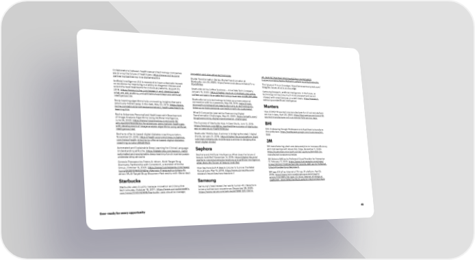 Collaborations between healthcare and technology companies innovation-and-disruptive-technologies x#:~:text=%E2%80%9CIt%20has%20become%20a%20 are driving the future of healthcare. https://www.roche.com/ Digital Transformation Series: Digital Transformation at buzzword,enabled%20by%20arti昀椀cial%20neural%20networks partnering/partnering-in-a-digital-era.htm Starbucks, July 22, 2020. https://www.youtube.com/watch?v=c- The future of AI is on the edge. https://www.samsungnext.com/ Arti昀椀cial intelligence (AI) is expected to have a dramatic impact fSjzQDNkw blog/the-future-of-ai-is-on-the-edge on medicine by improving our ability to diagnose disease and Starbucks Isn’t a Coffee Business — It’s a Data Tech Company, Samsung Research, Arti昀椀cial Intelligence: In the future, AI select the best treatments for individual patients, August 20, January 16, 2020. https://marker.medium.com/starbucks-isnt-a- technology will become much more prevalent and we will 2019. https://www.roche.com/research_and_development/ coffee-company-its-a-data-technology-business-ddd9b397d83e interact with smart devices on a daily basis. https://research. what_we_are_working_on/ophthalmology/diagnosis-arti昀椀cial- intelligence.htm Starbucks turns to technology to brew up a more personal samsung.com/arti昀椀cial-intelligence Deep-learning algorithms help uncovering insights that were connection with its customers, May 06, 2019. https://news. Munters previously hidden away in the dark, May 29, 2019. https://www. microsoft.com/transform/starbucks-turns-to-technology-to- roche.com/about/priorities/personalised_healthcare/machine- brew-up-a-more-personal-connection-with-its-customers/ learning.htm How COVID-19 spurred one manufacturer to roll out remote 昀椀eld What 5 Companies Learned by Overcoming Digital service in days, April 20, 2020. https://diginomica.com/covid-19- Roche Advances Personalized Healthcare with Development Transformation Challenges, May 22, 2020. https://what昀椀x.com/ spurred-manufacturer-roll-out-remote-昀椀eld-service-days blog/overcoming-digital-transformation-challenges/ of Image Analysis Algorithms Using Arti昀椀cial Intelligence, June 29, 2020. https://www.hospimedica.com/covid-19/ The Success of Starbucks App: A Case Study, June 12, 2018. BHI articles/294783208/roche-advances-personalized-healthcare- https://medium.com/@the_manifest/the-success-of-starbucks- with-development-of-image-analysis-algorithms-using-arti昀椀cial- app-a-case-study-f0af6709004d BHI: Embracing Google Workspace and AppSheet to transform intelligence.html the workplace. https://workspace.google.com/customers/bhi. Roche to offer AI-based digital diabetes coaching solution, Starbucks’ Mobile App: A winner in bridging the retail / digital html November 01, 2018. https://health.economictimes.indiatimes. divide, January 31, 2018. https://digital.hbs.edu/platform-digit/ com/news/health-it/roche-to-offer-ai-based-digital-diabetes- submission/starbucks-mobile-app-a-winner-in-bridging-the- 3M coaching-solution/66457823 retail-digital-divide/ Automated and Explainable Deep Learning for Clinical Language 3M manufacturing plant uses data analytics to increase ef昀椀ciency Understanding at Roche. https://databricks.com/session_na20/ Sephora and cost savings with Azure SQL Edge, December 11, 2020. automated-and-explainable-deep-learning-for-clinical-language- https://customers.microsoft.com/en-au/story/844496-3m- understanding-at-roche Sephora and Arti昀椀cial Intelligence: What does the future of manufacturing-azure-sql-edge beauty look like? November 14, 2018. https://digital.hbs.edu/ 3M Selects AWS as Its Preferred Cloud Provider for Enterprise Genesis Therapeutics Enters AI-driven, Multi-Target Drug platform-rctom/submission/sephora-and-arti昀椀cial-intelligence- IT, February 17, 2020. https://www.businesswire.com/news/ Discovery Partnership with Genentech, a member of Roche what-does-the-future-of-beauty-look-like/ home/20200217005043/en/3M-Selects-AWS-as-Its-Preferred- Group, October 19, 2020. https://www.businesswire.com/news/ How Sephora Built A Beauty Empire To Survive The Retail Cloud-Provider-for-Enterprise-IT home/20201019005182/en/Genesis-Therapeutics-Enters-AI- Apocalypse, May 16, 2018. https://www.cbinsights.com/ driven-Multi-Target-Drug-Discovery-Partnership-with-Genentech research/report/sephora-teardown/ 3M taps C3 IoT as Internet of Things, AI platform, April 5, 2018. https://www.hcinnovationgroup.com/clinical-it/ Starbucks Samsung article/13009561/3m-taps-c3-iot-as-internet-of-things-ai- platform#:~:text=3M%20will%20use%20C3%20IoT,%2C%20 Starbucks uses cloud to manage innovation and disruptive Samsung’s head researcher wants human–AI interactions technologies, October 10, 2014. https://www.computerweekly. to be a multisensory experience, December 09, 2020. com/news/2240232395/Starbucks-uses-cloud-to-manage- https://www.nature.com/articles/d41586-020-03414- Ever–ready for every opportunity 45