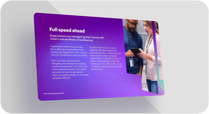 Full speed ahead Organizations are reimagining their futures with cloud in extraordinary circumstances Organizations’ resilience has been tested Regardless of the reason, everyone is like no other time in recent history, as the migrating while their industries and pandemic has changed how we live, consume businesses are in 昀氀ux—with key functions and work. Transformation is the new normal. such as customer service and supply chains facing new demands every day. It’s 吀栀at’s why many organizations are akin to a ship rebuilding its engine and reimagining their businesses by migrating retraining its crew, while somehow trying systems and applications to the cloud. Some to maintain its speed and course through a want to automate processes, scale capaci琀礀 ferocious storm. and create new growth opportunities. Others are migrating simply for cost savings and greater e昀케ciency. Ever–ready for every opportunity 33