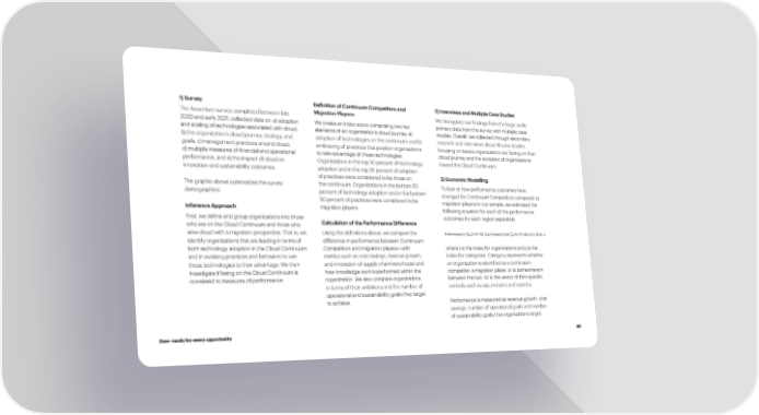 1) Survey De昀椀nition of Continuum Competitors and 2) Interviews and Multiple Case Studies The Accenture survey, completed between late Migration Players: We triangulate our 昀椀ndings from the large-scale 2020 and early 2021, collected data on: a) adoption We create an index score comprising two key primary data from the survey with multiple case and scaling of technologies associated with cloud, elements of an organization’s cloud journey: a) studies. Overall, we collected through secondary b) the organization’s cloud journey, strategy, and adoption of technologies on the continuum and b) research and interviews about 18 case studies goals, c) management practices around cloud, embracing of practices that position organizations focusing on issues organizations are facing on their d) multiple measures of 昀椀nancial and operational to take advantage of these technologies. cloud journey and the evolution of organizations performance, and e) the impact of cloud on Organizations in the top 30 percent of technology toward the Cloud Continuum. innovation and sustainability outcomes. adoption and in the top 30 percent of adoption of practices were considered to be those on 3) Economic Modelling The graphic above summarizes the survey the continuum. Organizations in the bottom 50 To look at how performance outcomes have demographics. percent of technology adoption and in the bottom changed for Continuum Competitors compared to 50 percent of practices were considered to be migration players in our sample, we estimated the Inference Approach migration players. following equation for each of the performance First, we de昀椀ne and group organizations into those Calculation of the Performance Difference outcomes for each region separately: who are on the Cloud Continuum and those who view cloud with a migration perspective. That is, we Using the de昀椀nitions above, we compare the Performance〗_i=∑_(j=1)^3 β_(1,j) 〖Category〗_ij+〖 ∑_(k=1)^n β〗_k X_(i,k)+ε_i identify organizations that are leading in terms of difference in performance between Continuum both technology adoption in the Cloud Continuum Competitors and migration players—with where i is the index for organizations and j is the and in evolving practices and behaviors to use metrics such as cost savings, revenue growth, index for categories. Category represents whether these technologies to their advantage. We then and innovation of supply chain/warehouse and an organization is identi昀椀ed as a continuum investigate if being on the Cloud Continuum is how knowledge work is performed within the competitor, a migration player, or is somewhere in correlated to measures of performance. organization. We also compare organizations between the two. Xk is the vector of 昀椀rm-speci昀椀c in terms of their ambitions and the number of controls such as size, industry and country. operational and sustainability goals they target to achieve. Performance is measured as revenue growth, cost savings, number of operational goals and number of sustainability goals that organizations target. Ever–ready for every opportunity 40