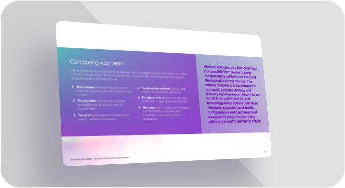 Composing your team. We have also created a first-of-its-kind Composable Tech Studio to bring Cracking the code on composable tech requires one-of-a kind technologies—and one-of-a-kind talent composability to life for our clients at and teams. As part of our delivery model, we have created six key roles designed to come together, the pace of business change. The integrating to serve the end customer: catalog of assets and accelerators in 1. The consumerleverages the applications— 4. The enterprise architectvisualizes and our studio includes strategy and they are the business user with a focus on the models the composable architecture. industry transformation blueprints, our end goal. 5. The data architect models the data layer Smart Enterprise Data Hub and 2. The assemblerchooses and composes underneath the composable architecture. technology integration accelerators. applications that will address specific 6. The makerdesigns and creates the modular The studio supports faster builds, business needs. business blocks and provides deep configurations and deployments of 3. The curator manages the marketplace for knowledge in developing software composable solutions, improving prebuilt, reusable components. applications. agility and speed to market for clients. Composing for agility in the era of compressed transformation 14