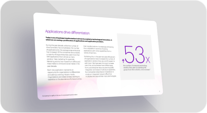 Applications drive differentiation. Today’s era of business transformation is driven by explosive technological innovation, in which we are seeing a proliferation of applications and application providers. During the past decade, while the number of their transformations—increasingly embracing cloud providers has consolidated, the number the multiplatform world by choosing of applications for the average large enterprise applications with niche capabilities from a has increased. Of the companies we surveyed, variety of partners. a majority of large enterprises used more than Exhibiting this, in the past two years 69 percent 500 applications from almost as many of organizations have increased the number of vendors. Take marketing, for example: application vendors they use, and 81 expect to Marketing activity has moved from offline and 53x mass media to online and social media in the add more.3 We have seen this trend increase past decade. over time, as businesses have shifted away the number of enterprise technology from just enterprise resource planning (ERP) vendors that cater to marketing has Each new application represents an integration and toward multicloud capabilities. 2 grown from 150 to 8,000, a 53x increase. opportunity for organizations to differentiate But companies today face an imperative: to and address evolving industry needs. create an integrated network effect that Organizations are indeed already starting to multiplies the value of their many technologies. capitalize on the abundance of choice to drive Composing for agility in the era of compressed transformation 3