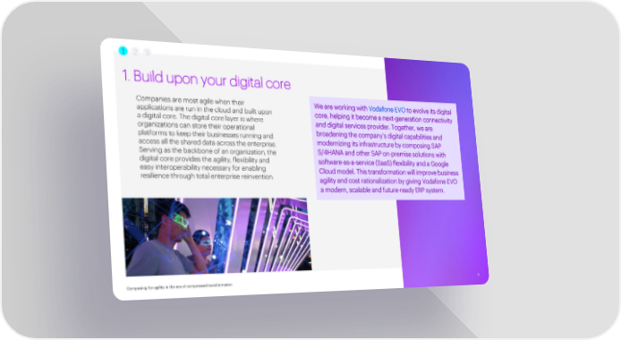 1 2 3 1. Build upon your digital core Companies are most agile when their We are working with Vodafone EVOto evolve its digital applications are run in the cloud and built upon core, helping it become a next-generation connectivity a digital core. The digital core layer is where and digital services provider. Together, we are organizations can store their operational broadening the company’s digital capabilities and platforms to keep their businesses running and modernizing its infrastructure by composing SAP access all the shared data across the enterprise. S/4HANA and other SAP on-premise solutions with Serving as the backbone of an organization, the digital core provides the agility, flexibility and software-as-a-service (SaaS) flexibility and a Google easy interoperability necessary for enabling Cloud model. This transformation will improve business resilience through total enterprise reinvention. agility and cost rationalization by giving Vodafone EVO a modern, scalable and future-ready ERP system. Composing for agility in the era of compressed transformation 1111