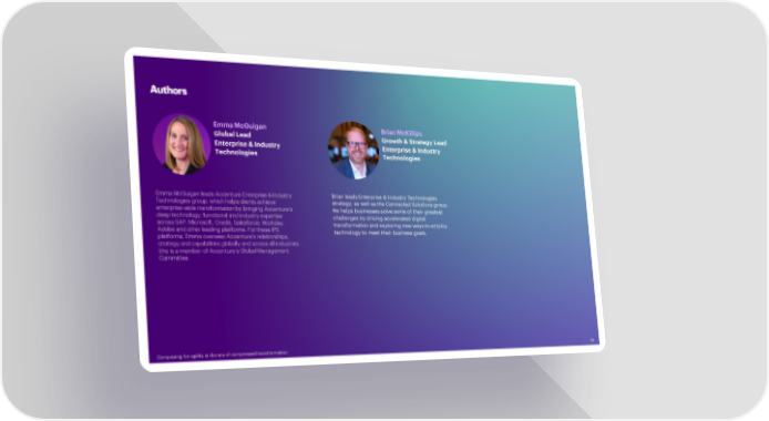 Authors Emma McGuigan Brian McKillips Global Lead Growth & Strategy Lead Enterprise & Industry Enterprise & Industry Technologies Technologies Emma McGuigan leads Accenture Enterprise & Industry Brian leads Enterprise & Industry Technologies Technologies group, which helps clients achieve strategy, as well as the Connected Solutions group. enterprise-wide transformation by bringing Accenture’s He helps businesses solve some of their greatest deep technology, functional and industry expertise challenges by driving accelerated digital across SAP, Microsoft, Oracle, Salesforce, Workday, transformation and exploring new ways to employ Adobe and other leading platforms. For these IPS technology to meet their business goals. platforms, Emma oversees Accenture’s relationships, strategy and capabilities globally and across all industries. She is a member of Accenture’s Global Management Committee. Composing for agility in the era of compressed transformation 19