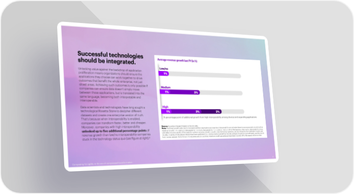 Successful technologies Average revenue growth last FY (in %) should be integrated. Unlocking value against the backdrop of application proliferation means organizations should ensure the applications they choose can work together to drive outcomes that benefit the whole enterprise, not just siloed areas. Achieving such outcomes is only possible if companies can ensure data doesn’t simply move between those applications, but is translated into the same language, becoming both interpretable and interoperable. Data scientists and technologists have long sought a technological Rosetta Stone to decipher different datasets and create one enterprise version of truth. 5 percentage point of additional growth from high interoperability among diverse and expanding applications That’s because when interoperability is enabled, companies can transform faster, better and cheaper. Moreover, companies with high interoperability Source: Accenture Research based on Survey data. Note: Additional growth rates due to increased platform exploration and seamless interoperability are estimates based on an econometric model such as unlocked up to five additional percentage pointsof Revenue Growth i= A x medium interoperability + B x high interoperability + C x controls + error, in which the baseline is the low/no interoperability group. revenue growth than low/no interoperability companies Estimates include a variety of firm-specific controls including industry, country, size, technology spending, and an interaction term between industry and country. A variety of robustness checks have been performed (i.e., scaling revenue growth by industry averages, by previous growth rates), and the results stuck in the technology status quo (see figure at right).4 hold. Survey sample= 4,053 firms in 19 industries and 23 countries. Revenue growth percentages have been rounded off to the nearest whole number. Composing for agility in the era of compressed transformation 4