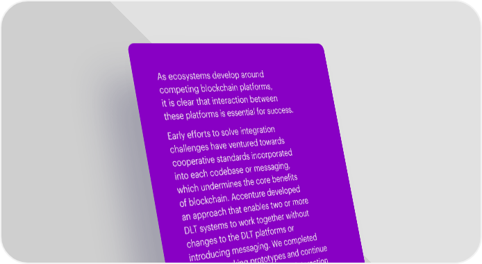 As ecosystems develop around competing blockchain platforms, it is clear that interaction between these platforms is essential for success. Early efforts to solve integration challenges have ventured towards cooperative standards incorporated into each codebase or messaging, which undermines the core bene昀椀ts of blockchain. Accenture developed an approach that enables two or more DLT systems to work together without changes to the DLT platforms or introducing messaging. We completed the 昀椀rst working prototypes and continue to re昀椀ne solutions that enable interaction between ecosystems while maximizing the bene昀椀ts of distributed ledgers. 2 CONNECTING ECOSYSTEMS: BLOCKCHAIN INTEGRATION