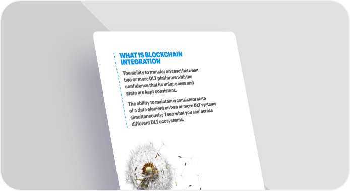WHAT IS BLOCKCHAIN INTEGRATION The ability to transfer an asset between two or more DLT platforms with the con昀椀dence that its uniqueness and state are kept consistent. The ability to maintain a consistent state of a data element on two or more DLT systems simultaneously; ‘I see what you see’ across different DLT ecosystems. 4 CONNECTING ECOSYSTEMS: BLOCKCHAIN INTEGRATION