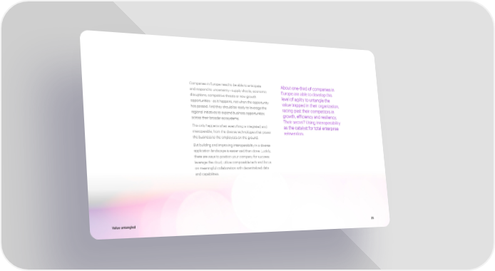 Companies in Europe need to be able to anticipate About one-third of companies in and respond to uncertainty—supply shocks, economic Europe are able to develop this disruptions, competitive threats or new growth level of agility to untangle the opportunities—as it happens, not when the opportunity has passed. And they should be ready to leverage the value trapped in their organization, regional initiatives to expand business opportunities racing past their competitors in across their broader ecosystems. growth, efficiency and resiliency. Their secret? Using interoperability This only happens when everything is integrated and as the catalyst for total enterprise interoperable, from the diverse technologies that power reinvention. the business to the employees on the ground. But building and improving interoperability in a diverse application landscape is easier said than done. Luckily, there are ways to position your company for success: leverage the cloud, utilize composable tech and focus on meaningful collaboration with decentralized data and capabilities. Value untangled 25