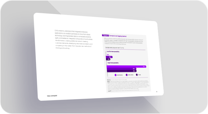 CXOs need to understand that integrated enterprise applications can enable businesses to move from siloed Figure 2 Europe is not lagging behind technology and fragmented data to connected solutions, When it comes to unlocking additional growth with interoperability, Europe is ahead of agility and resilience. Integration brings about true business the AAPAC region. European companies with high interoperability unlocked up to four transformation, creating additional value in meeting additional percentage points of revenue growth compared to low/no interoperability customer demands, developing new revenue streams, and companies stuck in the technology status quo. competing in the market. But it requires new methods of Average revenue growth last FY (in %) thinking and working. Low/No Interoperability 0% 2% 1% High Interoperability 7% 5% 5% North America APAC & Africa Europe Note: Revenue growth percentages have been rounded off to the nearest whole number. Source: Accenture Research based on Survey data. Additional growth rates due to increased platform exploration and seamless interoperability are estimates based Note: Additional growth rates due to increased platform exploration and seamless interoperability are estimates on an econometric model such as Revenue Growth = Ax medium interoperability + B x high interoperability+ C based on an econometric model such as Revenue Growth i= A x medium interoperability + B x high interoperability controls + error, in which the baseline is the low/no interoperability group. Estimates include a variety of + C controls + error, in which the baseline is the low/no interoperability group. Estimates include a variety of firm- firm-specific controls including industry, country, size, technology spending and an interaction term between specific controls including industry, country, size, technology spending and an interaction term between industry industry and country. A variety of robustness checks have been performed (i.e., scaling revenue growth by industry and country. A variety of robustness checks have been performed (i.e., scaling revenue growth by industry averages, averages, by previous growth rates and the results holds. Survey sample = 4,053 firms in 19 industries and 23 by previous growth rates and the results holds. Survey sample= 4,053 firms in 19 industries and 23 countries. Revenue growth percentages have been rounded off to the nearest whole number. countries. Revenue growth percentages have been rounded off to the nearest whole number. Last FY implies the latest annual company financials reported before February 2022. Last FY implies the latest annual company financials reported before February 2022. Value untangled 9