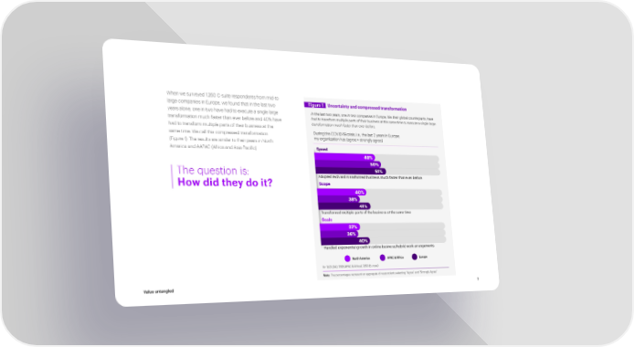 When we surveyed 1,260 C-suite respondents from mid-to large companies in Europe, we found that in the last two Figure 1 Uncertainty and compressed transformation years alone, one in two have had to execute a single large In the last two years, one in two companies in Europe, like their global counterparts, have transformation much faster than ever before and 40% have had to transform multiple parts of their business at the same time or execute a single large had to transform multiple parts of their business at the transformation much faster than ever before. same time. We call this compressed transformation During the COVID-19 crisis, i.e., the last 2 years in Europe, (Figure 1). The results are similar to their peers in North my organization has (agree + strongly agree) America and AAPAC (Africa and Asia-Pacific). Speed 48% 50% 51% The question is: Adopted tech and transformed business much faster than ever before How did they do it? Scope 40% 40% 38% 41% Transformed multiple parts of the business at the same time Scale 37% 36% 40% Handled exponential growth in online business/hybrid work arrangements North America APAC & Africa Europe N= 1501 (NA), 1193 (APAC & Africa), 1260 (Europe) Note: The percentages represent an aggregate of respondents selecting “Agree” and “Strongly Agree” Value untangled 7