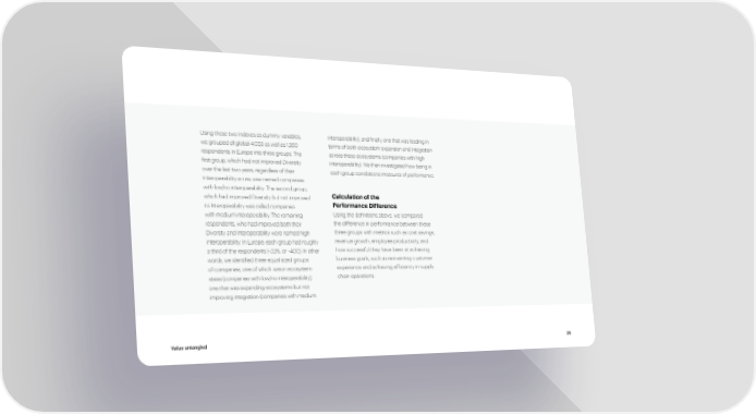 Using these two indexes as dummy variables, interoperability), and finally, one that was leading in we grouped all global 4,053 as well as 1,260 terms of both ecosystem expansion and integration respondents in Europe into three groups. The across these ecosystems (companies with high first group, which had not improved Diversity interoperability). We then investigated how being in over the last two years, regardless of their each group correlates to measures of performance. Interoperability score, was named companies with low/no interoperability. The second group, which had improved Diversity but not improved Calculation of the its Interoperability was called companies Performance Difference with medium interoperability. The remaining Using the definitions above, we compared respondents, who had improved both their the difference in performance between these Diversity and Interoperability were named high three groups with metrics such as cost savings, interoperability. In Europe, each group had roughly revenue growth, employee productivity, and a third of the respondents (~33%, or ~400). In other how successful they have been at achieving words, we identified three equal sized groups business goals, such as reinventing customer of companies, one of which was in ecosystem experience and achieving efficiency in supply stasis (companies with low/no interoperability), chain operations. one that was expanding ecosystems but not improving integration (companies with medium Value untangled 29