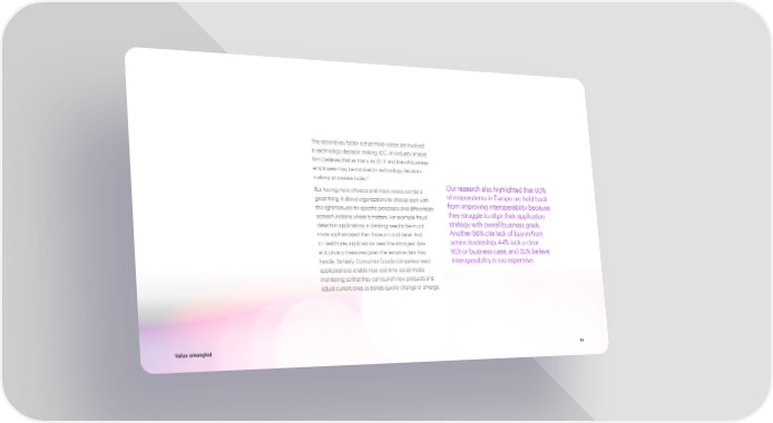 The second key factor is that more voices are involved in technology decision making. IDC, an industry analyst firm, believes that as many as 20 IT and line-of-business employees may be involved in technology decision- making processes today.3 But having more choices and more voices can be a Our research also highlighted that 60% great thing. It allows organizations to choose tech with of respondents in Europe are held back the right features for specific processes and differentiate from improving interoperability because across functions where it matters. For example, fraud they struggle to align their application detection applications in Banking need to be much strategy with overall business goals. more sophisticated than those in Food Retail. And Another 56% cite lack of buy-in from in Healthcare, applications need the strongest data senior leadership; 44% lack a clear and privacy measures given the sensitive data they ROI or business case; and 35% believe handle. Similarly, Consumer Goods companies need interoperability is too expensive. applications to enable near real-time social media monitoring so that they can launch new products and adjust current ones as trends quickly change or emerge. Value untangled 14