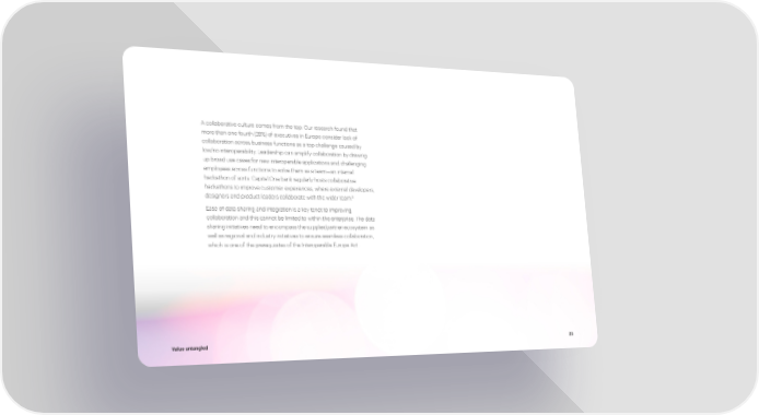 A collaborative culture comes from the top: Our research found that more than one fourth (28%) of executives in Europe consider lack of collaboration across business functions as a top challenge caused by low/no interoperability. Leadership can amplify collaboration by drawing up broad use cases for new interoperable applications and challenging employees across functions to solve them as a team—an internal hackathon of sorts. Capital One bank regularly hosts collaborative hackathons to improve customer experiences, where external developers, designers and product leaders collaborate with the wider team.5 Ease of data sharing and integration is a key tenet to improving collaboration and this cannot be limited to within the enterprise. The data sharing initiatives need to encompass the supplier/partner ecosystem as well as regional and industry initiatives to ensure seamless collaboration, which is one of the prerequisites of the Interoperable Europe Act. Value untangled 23