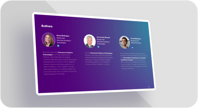Authors Emma McGuigan Jan van den Bremen Surya Mukherjee Global Lead – Europe Lead – Research Lead – Enterprise & Industry Enterprise & Industry Global Technology Technologies Technologies Emma McGuigan leads Enterprise & Industry Jan leads Enterprise & Industry Technologies Surya Mukherjee is a Senior Principal at Accenture Technologies, which helps clients achieve in Europe, which helps clients achieve enterprise- and Head of Technology Research for Europe. He has enterprise-wide transformation by bringing wide transformation by bringing Accenture’s deep over two decades of experience as an advisor Accenture’s deep technology, functional and industry technology, functional and industry expertise to platform providers and their users and has expertise across SAP, Microsoft, Oracle, Salesforce, across leading platforms. He is a member of been quoted on the Wall Street Journal, ZDnet and Workday, Adobe and other leading platforms. For Accenture’s Global Leadership Committee. Computer Weekly. His interest lies in exploring the these IPS platforms, Emma oversees Accenture’s transformative impact of technologies on industries, relationships, strategy and capabilities globally and companies, and brands. across all industries. She is a member of Accenture’s Global Management Committee. 32
