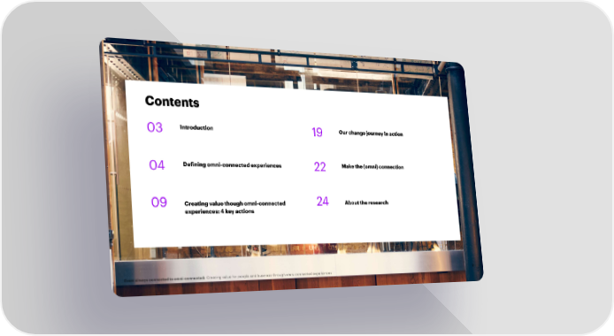 Contents Introduction 03 19 Our change journey in action Make the (omni) connection 04 De昀椀ning omni-connected experiences 22 About the research 09 Creating value though omni-connected 24 experiences: 4 key actions From always connected to omni-connected: Creating value for people and business through omni-connected experiences 2