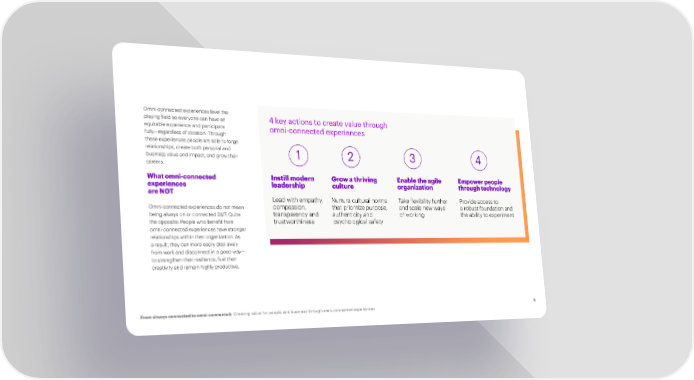 Omni-connected experiences level the 4 key actions to create value through playing 昀椀eld so everyone can have an equitable experience and participate omni-connected experiences fully—regardless of location. Through these experiences people are able to forge relationships, create both personal and 1 2 3 4 business value and impact, and grow their careers. What omni-connected Instill modern Grow a thriving Enable the agile Empower people experiences are NOT leadership culture organization through technology Lead with empathy, Nurture cultural norms Take 昀氀exibility further Provide access to Omni-connected experiences do not mean compassion, that prioritize purpose, and scale new ways a robust foundation and being always on or connected 24/7. Quite transparency and authenticity and of working the ability to experiment trustworthiness psychological safety the opposite. People who bene昀椀t from omni-connected experiences have stronger relationships within their organization. As a result, they can more easily step away from work and disconnect in a good way— to strengthen their resilience, fuel their creativity and remain highly productive. From always connected to omni-connected: Creating value for people and business through omni-connected experiences 5
