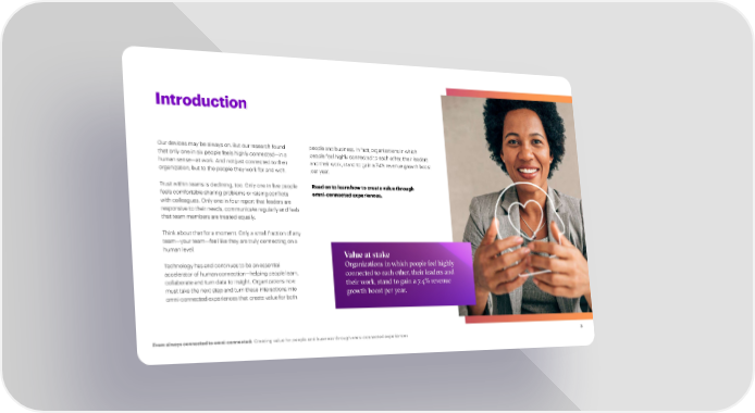 Introduction Our devices may be always on. But our research found people and business. In fact, organizations in which that only one in six people feels highly connected—in a people feel highly connected to each other, their leaders human sense—at work. And not just connected to their and their work, stand to gain a 7.4% revenue growth boost organization, but to the people they work for and with. per year. Read on to learn how to create value through Trust within teams is declining, too. Only one in 昀椀ve people omni-connected experiences. feels comfortable sharing problems or raising con昀氀icts with colleagues. Only one in four report that leaders are responsive to their needs, communicate regularly and feels that team members are treated equally. Think about that for a moment. Only a small fraction of any team—your team—feel like they are truly connecting on a human level. Value at stake Technology has and continues to be an essential Organizations in which people feel highly accelerator of human connection—helping people learn, connected to each other, their leaders and collaborate and turn data to insight. Organizations now their work, stand to gain a 7.4% revenue must take the next step and turn these interactions into growth boost per year. omni-connected experiences that create value for both From always connected to omni-connected: Creating value for people and business through omni-connected experiences 3