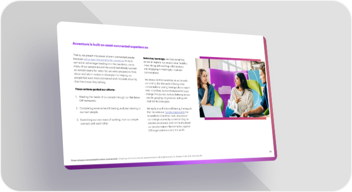 Accenture is built on omni-connected experiences That is, we preach the power of omni-connected people Some key learnings: We discovered that, because we’ve seen the bene昀椀ts for ourselves. In truth, across all regions, our people value 昀氀exibility we had an advantage heading into the pandemic, since most, along with working collaboratively many of our people around the world had already worked and engaging in meaningful, in-person on remote teams for years. So, we were prepared to think conversations. about and set in motion a robust plan for helping our people feel even more connected and included, ensuring We always remind ourselves, as we do with that they know they belong. our clients, that the work of being omni- connected and strengthening culture doesn’t These actions guided our efforts: end—it evolves. As we embrace continuous change, the journey involves listening to your 1. Meeting the needs of our people through our Net Better people, gauging progress and acting with Off framework. intention to close gaps. 2. Completing external benchmarking and also listening to We apply a sophisticated listening framework our own people. that includes our Transformation GPS tool to establish a baseline, track progress on 3. Examining our own ways of working, how our people our change journey by understanding our connect with each other. people’s experience, and continually power our transformation—benchmarked against 500 organizations around the world. From always connected to omni-connected: Creating omni-connected experiences to strengthen culture, deepen trust and drive results 20