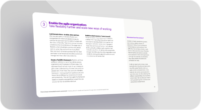 3 Enable the agile organization: Take 昀氀exibility further and scale new ways of working Look beyond where—to what, when and how. Rede昀椀ne what it means to "come to work". What about front-line workers? After two-plus years of remote or hybrid work The entire notion of “coming to work” is ready for arrangements for millions of people, it’s easy to a refresh. That means 昀椀guring out how teams can Whether it’s health practitioners, grocery confuse the commute from the bed to the desk with maximize the bene昀椀ts of both time together and store clerks or delivery drivers, an the notion of 昀氀exibility. They’re not one and the same. time apart—and what matters most to people to estimated 2.7 billion front-line essential Location is only one small piece of the larger idea of make their commute worthwhile. It also requires 12 And workers keep our world working. while they may not have a choice in work 昀氀exibility, which should also consider what people thinking ahead and designing for people across work on, when they work and how. Today, fewer multiple types of work locations and arrangements. location, there are other areas of 昀氀exibility than one-fourth of workers surveyed feel they have And just like individuals, the entire organization must that companies can explore to provide more autonomy in their work experiences permission to be 昀氀exible and have the autonomy to be able to pivot quickly, given that work and world manage their time to be most productive. —through the tools they use, decisions circumstances will remain 昀氀uid. they make, bene昀椀ts they select and Create a 昀氀exibility framework. Flexibility will have schedules they keep. a different de昀椀nition or set of boundaries at every organization and for people in different roles. One It’s also an opportunity to take a more nuanced look at the roles and tasks which size never 昀椀ts all, not even most. It’s up to leaders to gain a clear understanding of where, when and how may offer greater 昀氀exibility when you apply an omni-connection lens. In one people work. From there, they can build a 昀氀exibility framework—moving away from rigid structures and example, lab workers were expected to hierarchies and designing instead around people work fully onsite. Yet after analyzing their and connectivity. They can then apply the framework different responsibilities, they found that based on people’s responsibilities to reach the best certain tasks—like recording lab notes or solution for the role and the individual. writing research grants—could be done productively outside the lab. From always connected to omni-connected: Creating value for people and business through omni-connected experiences 15
