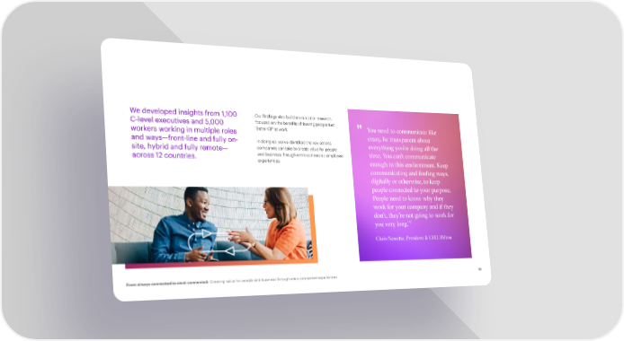 We developed insights from 1,100 Our 昀椀ndings also build on our prior research, focused on the bene昀椀ts of leaving people Net C-level executives and 5,000 Better Off at work. " You need to communicate like workers working in multiple roles crazy, be transparent about and ways—front-line and fully on- In doing so, we’ve identi昀椀ed the key actions everything you’re doing all the companies can take to create value for people site, hybrid and fully remote— and business through omni-connected employee time. You can’t communicate across 12 countries. experiences. enough in this environment. Keep communicating and 昀椀nding ways, digitally or otherwise, to keep people connected to your purpose. People need to know why they work for your company and if they don’t, they’re not going to work for you very long.”7 Chris Nasse琀琀a, President & CEO, Hilton From always connected to omni-connected: Creating value for people and business through omni-connected experiences 10