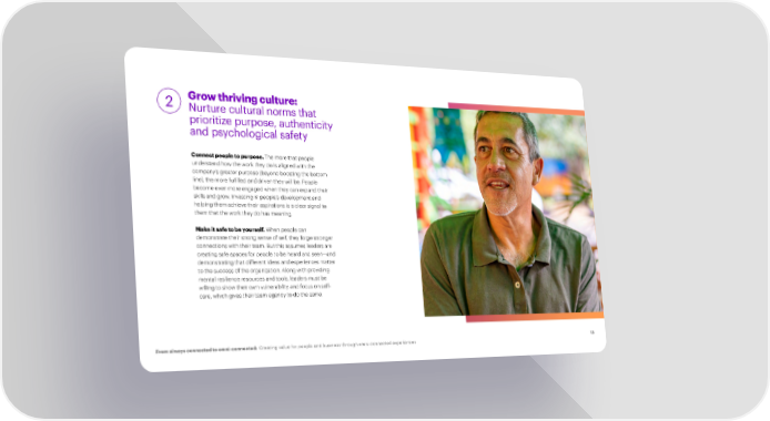 2 Grow thriving culture: Nurture cultural norms that prioritize purpose, authenticity and psychological safety Connect people to purpose. The more that people understand how the work they do is aligned with the company’s greater purpose (beyond boosting the bottom line), the more ful昀椀lled and driven they will be. People become even more engaged when they can expand their skills and grow. Investing in people’s development and helping them achieve their aspirations is a clear signal to them that the work they do has meaning. Make it safe to be yourself. When people can demonstrate their strong sense of self, they forge stronger connections with their team. But this assumes leaders are creating safe spaces for people to be heard and seen—and demonstrating that different ideas and experiences matter to the success of the organization. Along with providing mental resilience resources and tools, leaders must be willing to show their own vulnerability and focus on self- care, which gives their team agency to do the same. From always connected to omni-connected: Creating value for people and business through omni-connected experiences 13