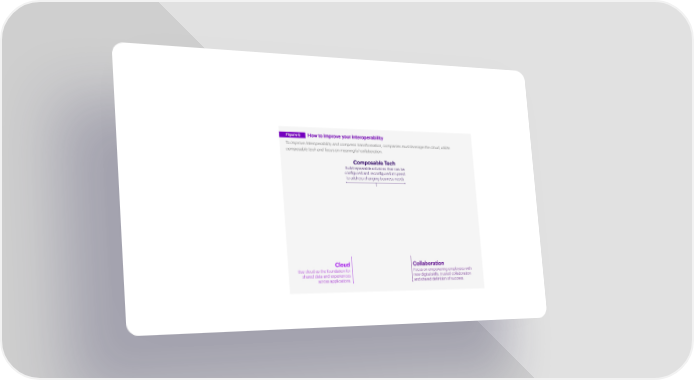 Figure 6 How to improve your interoperability To improve interoperability and compress transformation, companies must leverage the cloud, utilize composable tech and focus on meaningful collaboration. Composable Tech Build repeatable solutions that can be configured and reconfigured at speed to address changing business needs Cloud Collaboration Use cloud as the foundation for Focus on empowering employees with shared data and experiences new digital skills, trusted collaboration across applications. and shared definition of success.