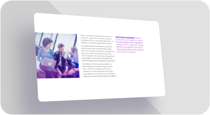 Today’s companies must anticipate and respond to One in three companies is able to uncertainty—supply shocks, economic disruptions, develop this level of agility to untangle competitive threats or new growth opportunities—as the value trapped in their organization, it happens, not when the opportunity has passed. racing past their competitors in growth, By compressing their transformation from years to efficiency and resiliency. Their secret? months (or even days) and transforming multiple Using interoperability as the catalyst for parts of the business simultaneously, companies can total enterprise reinvention. overcome obstacles and embrace opportunities. This only happens when everything is integrated and interoperable, from the diverse technologies that power the business to the employees on the ground. But building and improving interoperability in a diverse application landscape is easier said than done. Luckily, there are ways to position your company for success: leverage the cloud, utilize composable tech, and finally, focus on meaningful collaboration with decentralized data and capabilities.