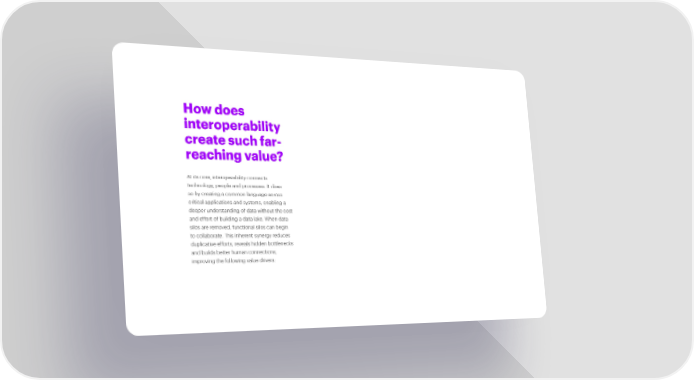 How does interoperability create such far- reaching value? At its core, interoperability connects technology, people and processes. It does so by creating a common language across critical applications and systems, enabling a deeper understanding of data without the cost and effort of building a data lake. When data silos are removed, functional silos can begin to collaborate. This inherent synergy reduces duplicative efforts, reveals hidden bottlenecks and builds better human connections, improving the following value drivers: