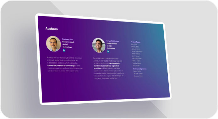 Authors Pradeep Roy Surya Mukherjee Project Team: Research Lead Research Lead Ajay Garg Global Europe Chiara Addis Technology Technology Ezequiel Tacsir Gargi Chakrabarty Jakub Wiatrak Krish Jhaveri Pradeep Roy is a Managing Director at Accenture Surya Mukherjee is a Senior Principal at Mariusz Bidelski and leads global Technology Research. He Accenture and Head of Technology Research Mélina Viglino is most active on topics which explore the for Europe. He has over two decades of Sandra Najem innovation potential of technology to drive experience as an advisor to platform Shachi Jain business reinvention and enable socio-economic providers and their users and has been Acknowledgments: transformation to create 360-degree value. quoted on the Wall Street Journal, ZDnet and Salena Gallo Computer Weekly. His interest lies in exploring Jennifer Cronin the transformative impact of technologies on Shannon Mapp industries, companies, and brands.