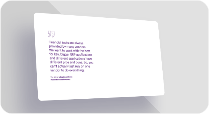 Financial tools are always provided by many vendors. We want to work with the best for key, bigger ERP applications and different applications have different pros and cons. So, you can’t actually just rely on one vendor to do everything. The CIO of a Southeast Asian Health Services Company