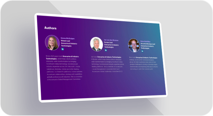 Authors Emma McGuigan Jan van den Bremen Brian McKillips Global Lead Europe Lead Growth & Strategy Lead Enterprise & Industry Enterprise & Industry Enterprise & Industry Technologies Technologies Technologies Emma McGuigan leads Enterprise & Industry Jan leads Enterprise & Industry Technologies Brian leads Enterprise & Industry Technologies Technologies, which helps clients achieve in Europe, which helps clients achieve enterprise- strategy, as well as the Connected Solutions enterprise-wide transformation by bringing wide transformation by bringing Accenture’s deep group. He helps businesses solve some of their Accenture’s deep technology, functional and technology, functional and industry expertise across greatest challenges by driving accelerated digital industry expertise across SAP, Microsoft, Oracle, leading platforms. He is a member of Accenture’s transformation and exploring new ways to employ Salesforce, Workday, Adobe and other leading Europe Management Committee (EMC) and technology to meet their business goals. platforms. For these IPS platforms, Emma oversees Accenture’s Global Leadership Committee (GLC). Accenture’s relationships, strategy and capabilities globally and across all industries. She is a member of Accenture’s Global Management Committee.