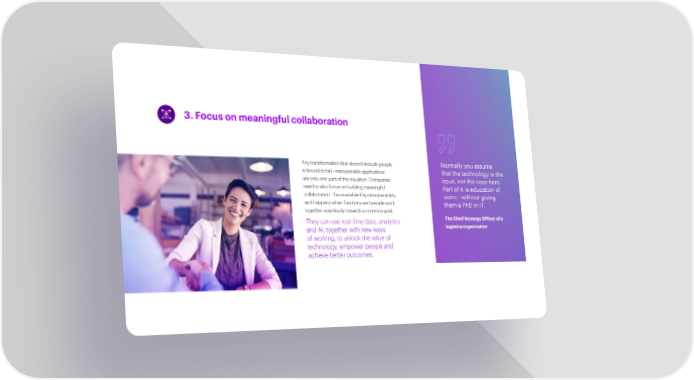 3.Focus on meaningful collaboration Any transformation that doesn’t include people Normally you assume is bound to fail—interoperable applications that the technology is the are only one part of the equation. Companies issue, not the case here. need to also focus on building meaningful Part of it is education of collaboration. This is enabled by interoperability users—without giving and happens when functions and people work them a PhD in IT. together seamlessly towards a common goal. They can use real-time data, analytics The Chief Strategy Officer of a and AI, together with new ways logistics organization of working, to unlock the value of technology, empower people and achieve better outcomes.