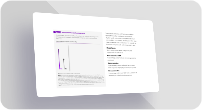 Figure 2 Interoperability accelerates growth That’s not all. Companies with high interoperability— especially those that manufacture, source or sell Companies with high interoperability unlocked up to five additional percentage points physical goods—also outpace companies with low/no of revenue growth than low/no interoperability companies stuck in the technology interoperability in profitability, resiliency and other value- status quo. Average revenue growth last FY (in %) creation measures critical to business. For example, we found that companies with high interoperability were: More efficient: 12 percentage points better at improving their supply chain and operations More successful at CX: 16 percentage points better at reinventing customer experience More productive: 12 percentage points more likely to be successful 6x 4x when improving employee productivity is a priority More sustainable: Source: Accenture Research based on Survey data. 4 percentage points more likely to be successful at Source: Accenture Research based on Survey data. Note: Additional growth rates due to increased platform exploration and seamless interoperability are Note: Additional growth rates due to increased platform exploration and seamless interoperability are estimates embracing sustainable business practices estimates based on an econometric model such as Revenue Growth i= A x medium interoperability + B x high based on an econometric model such as Revenue Growth i= A x medium interoperability + B x high interoperability interoperability + C controls + error, in which the baseline is the low/no interoperability group. Estimates include + C controls + error, in which the baseline is the low/no interoperability group. Estimates include a variety of a variety of firm-specific controls including industry, country, size, technology spending and an interaction firm-specific controls including industry, country, size, technology spending and an interaction term between term between industry and country. A variety of robustness checks have been performed (i.e., scaling revenue industry and country. A variety of robustness checks have been performed (i.e., scaling revenue growth by industry growth by industry averages, by previous growth rates and the results holds. Survey sample= 4,053 firms in 19 averages, by previous growth rates and the results holds. Survey sample= 4,053 firms in 19 industries and 23 industries and 23 countries. Revenue growth percentages have been rounded off to the nearest whole number. countries. Revenue growth percentages have been rounded off to the nearest whole number. Last FY implies the latest annual company financials reported before February 2022. Last FY implies the latest annual company financials reported before February 2022.