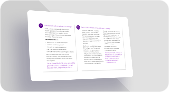 ENGIE excels with a multi-vendor strategy RetiPiù S.R.L. delivers with an SAP-centric strategy 16 The utility also uses the SAP Enterprise ENGIE, a French multinational utility, leverages In contrast, RetiPiù S.R.L., an Italian multiple applications from different providers energy company, relies on SAP for Asset Management solution to create to run its business, bring together 170,000 most of its applications. Its relatively digital twins for its equipment and employees across 70 countries and disseminate homogenous application stack builds activate predictive models. And it uses knowledge of customer needs. native interoperability among its SAP IoT solutions to gather detailed The company relies on: applications and allows it to transform sensor data from network equipment multiple parts of the business at the that it shares via mobile applications 10 • Salesforce for customer relationships 17 same time. with field technicians. • Oracle for talent management11 RetiPiù S.R.L. uses SAP S/4HANA and The company now receives 12 • Microsoft for employee experience SAP Intelligent Asset Management information and can update work 13 • SAP Concur for time and expenses applications to improve customer order statuses in real time. 14 experiences. This has unified its • SAP S/4 HANA on AWS Cloud for global finance The result? A 100% increase in ENGIE is deeply aware of its multi-provider intelligent asset maintenance system, the pieces of equipment it can 15 enabling better resource management application strategy and invests in Dell Boomi, and real-time mobile access. Field manage on the network— an integration provider that connects its diverse engineers can now remotely resolve from 12,000 to 24,000— stack together. issues and the company has achieved a and a 50% reduction in This works well for ENGIE: It has seen a 70% 20% improvement in capitalization. maintenance cost. growth in sales opportunities in the past couple of years, despite the pandemic.