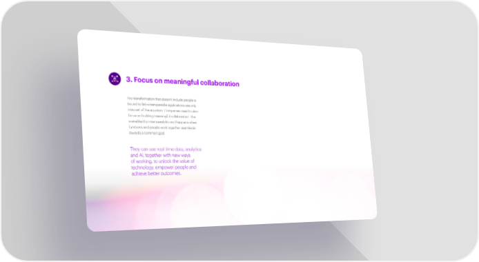 3.Focus on meaningful collaboration Any transformation that doesn’t include people is bound to fail—interoperable applications are only one part of the equation. Companies need to also focus on building meaningful collaboration. This is enabled by interoperability and happens when functions and people work together seamlessly towards a common goal. They can use real-time data, analytics and AI, together with new ways of working, to unlock the value of technology, empower people and achieve better outcomes.