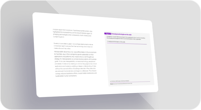 A recent report from Accenture, Total Enterprise Reinvention, also highlighted the increased focus of the Growth Markets region on Figure 3 Emerging technologies on the radar emerging technologies when compared to North America and Companies in Growth Markets are ahead of their global peers when it comes to evaluating Europe (Figure 3). the emerging technologies and their future implementation in their organization. Emerging technologies on the radar Diversity in providers is great – but as these deployments mature, companies need to ensure that their technology stack does not create silos and trap value. Interoperability becomes a key value differentiator in this environment to maximize value. When companies spend substantially on their applications and platforms, they need to have a well thought out strategy for interoperability to connect diverse systems with business goals. At its core, interoperability connects technology, people and processes. It does so by creating a common language across critical applications and systems, enabling a deeper understanding of data without the cost and effort of building a data lake. When data silos are removed, functional silos can begin to collaborate. This inherent synergy reduces duplicative efforts, reveals hidden bottlenecks and builds better human connections. N= 1,501 (NA), 1,260 (Europe), 1,292 (Growth Markets) Source: Accenture Total Enterprise Reinvention Survey data Note: The percentages represent the respondents that are “currently monitoring and screening the emerging technologies in their organization”. Growth Markets includes Asia-Pacific, Middle East, and Latin America regions.
