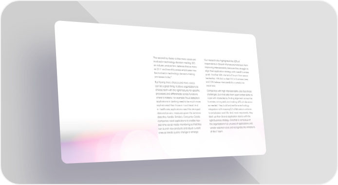The second key factor is that more voices are Our research also highlighted that 62% of involved in technology decision making. IDC, respondents in Growth Markets are held back from an industry analyst firm, believes that as many improving interoperability because they struggle to as 20 IT and line-of-business employees may align their application strategy with overall business be involved in technology decision-making goals. Another 59% cite lack of buy-in from senior processes today.5 leadership; 45% lack a clear ROI or business case; But having more choices and more voices and 33% believe interoperability is simply too can be a great thing. It allows organizations to expensive. choose tech with the right features for specific Companies with high interoperability also face these processes and differentiate across functions challenges. But what sets them apart is their ability to where it matters. For example, fraud detection cope with obstacles by finding alignment across the applications in Banking need to be much more business, acting early and making difficult decisions sophisticated than those in Food Retail. And as needed. They build and reinforce technology in Healthcare, applications need the strongest integration with meaningful collaboration—intrinsic data and privacy measures given the sensitive to employees’ work life. And, most importantly, they data they handle. Similarly, Consumer Goods back up their diverse application stacks with the companies need applications to enable near right business strategy. One that is conscious of real-time social media monitoring so that they the organization’s full universe of applications and can launch new products and adjust current vendor selection style and recognizes the limitations ones as trends quickly change or emerge. of the IT team.