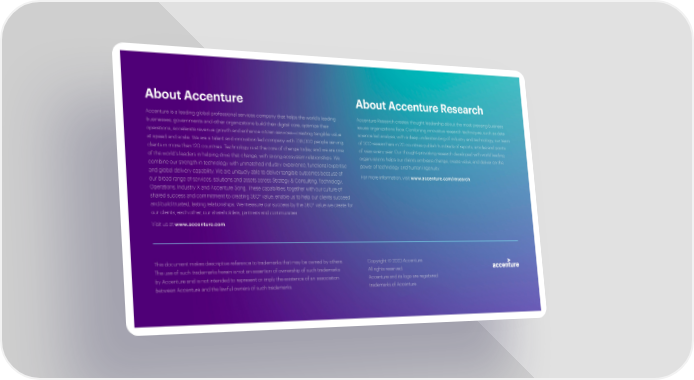 About Accenture About Accenture Research Accenture is a leading global professional services company that helps the world’s leading Accenture Research creates thought leadership about the most pressing business businesses, governments and other organizations build their digital core, optimize their issues organizations face. Combining innovative research techniques, such as data operations, accelerate revenue growth and enhance citizen services—creating tangible value science led analysis, with a deep understanding of industry and technology, our team at speed and scale. We are a talent and innovation led company with 738,000 people serving of 300 researchers in 20 countries publish hundreds of reports, articles and points clients in more than 120 countries. Technology is at the core of change today, and we are one of view every year. Our thought-provoking research developed with world leading of the world’s leaders in helping drive that change, with strong ecosystem relationships. We organizations helps our clients embrace change, create value, and deliver on the combine our strength in technology with unmatched industry experience, functional expertise power of technology and human ingenuity. and global delivery capability. We are uniquely able to deliver tangible outcomes because of For more information, visit www.accenture.com/research. our broad range of services, solutions and assets across Strategy & Consulting, Technology, Operations, Industry X and Accenture Song. These capabilities, together with our culture of shared success and commitment to creating 360° value, enable us to help our clients succeed and build trusted, lasting relationships. We measure our success by the 360° value we create for our clients, each other, our shareholders, partners and communities. Visit us at www.accenture.com. This document makes descriptive reference to trademarks that may be owned by others. Copyright © 2023 Accenture. The use of such trademarks herein is not an assertion of ownership of such trademarks All rights reserved. by Accenture and is not intended to represent or imply the existence of an association Accenture and its logo are registered between Accenture and the lawful owners of such trademarks. trademarks of Accenture.