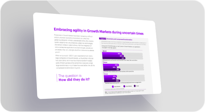 Embracing agility in Growth Markets during uncertain times Enterprises in Growth Markets have been navigating a difficult and an uncertain economic environment not unlike their Figure 4 Uncertainty and compressed transformation global counterparts. In these unpredictable times, they need to In the last two years, one in two companies in Growth Markets have had to transform multiple parts of quickly adapt to new circumstances, adopt new technologies their business at the same time or execute a single large transformation much faster than ever before. and remain nimble in order to thrive. With the integration of During the COVID-19 crisis, i.e., last 2 years in Growth Markets, my organization various enterprise applications and technologies, people and has (agree + strongly agree) processes, they can untangle value from chaos and accelerate Speed growth. 48% When we surveyed ~1,300 C-suite respondents from mid-to- 50% large companies in Growth Markets, we found that in the last 51% two years alone, one in two have had to transform multiple Adopted tech and transformed business much faster than ever before parts of their business at the same time or execute a single Scope large transformation much faster than ever before. We call this 40% 38% 40% compressed transformation (Figure 4). 41% Transformed multiple parts of the business at the same time The question is: Scale 37% How did they do it? 36% 40% Handled exponential growth in online business/hybrid work arrangements North America Growth Markets Europe N= 1,501 (NA), 1,260 (Europe), 1,292 (Growth Markets) Note: The percentages represent aggregate of respondents selecting “Agree” and “Strongly Agree”. Growth Markets includes Asia-Pacific, Middle East, and Latin America regions.